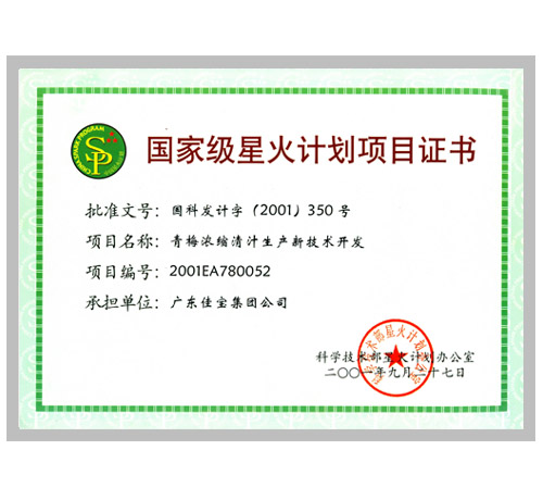 2001年 青梅濃縮汁 科技部星火計劃辦公室
