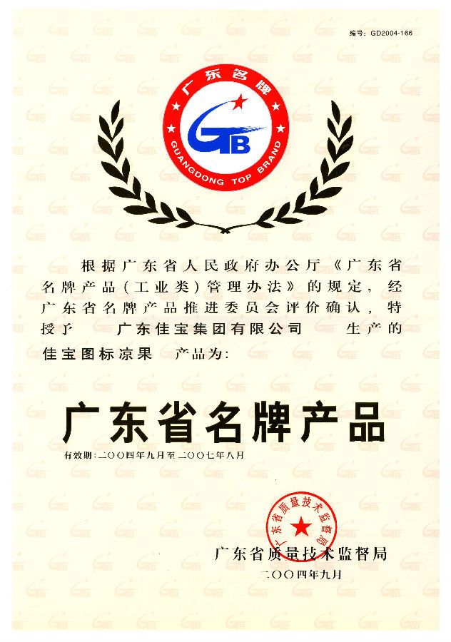 2004年 佳寶涼果 廣東省質(zhì)量技術(shù)監(jiān)督管理局